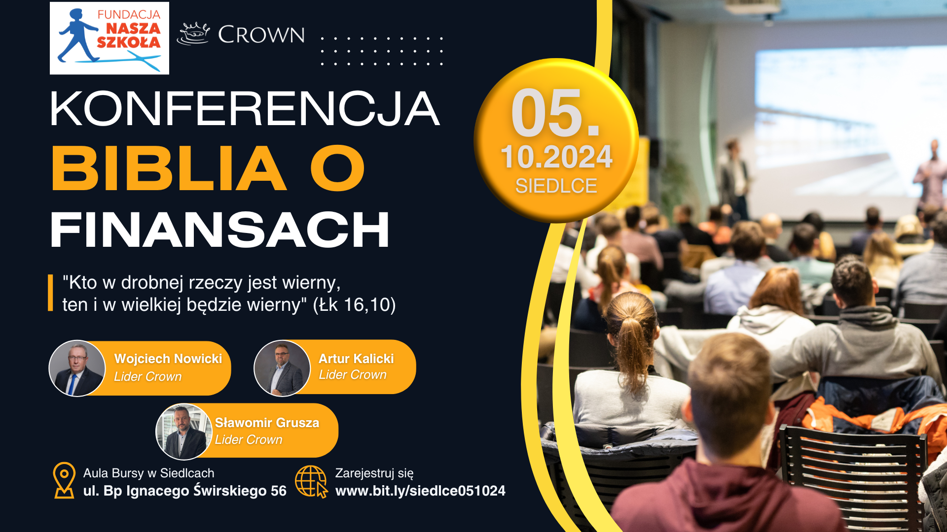 Organizatorem konferencji jest Fundacja Nasza Szkoła przy współpracy z Fundacją Crown. Konferencja „Biblia o finansach” to jednodniowe wydarzenie składające się z 6 sesji wykładowych. Podczas każdej sesji przybliżone zostaną kluczowe biblijne zasady oraz możliwość ich praktycznego zastosowania w życiu osobistym. Uczestnicy otrzymają pomocne narzędzia usprawniające funkcjonowanie osobistych finansów.